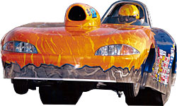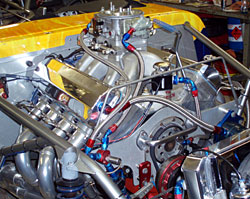 In terms of performance, with the old 532" motor, the car has run 8.32 @ 166 MPH out the back door, weighing in at 2500 lbs. On the throttle stop it has run as fast as 161 MPH at 9.90. with the 565" motor, the car has run 7.81 @ 175 MPH off the stop and 9.90 @ 170 on the throttle stop.
