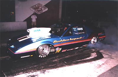 Ray doing a night time burnout at Epping with Mike looking on in the background.