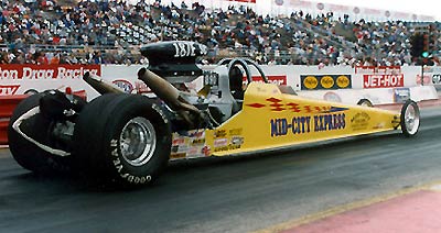 Mike running Mike Caron's Mid City Express dragster at Maple Grove at the 2000 Keystone Nationals.